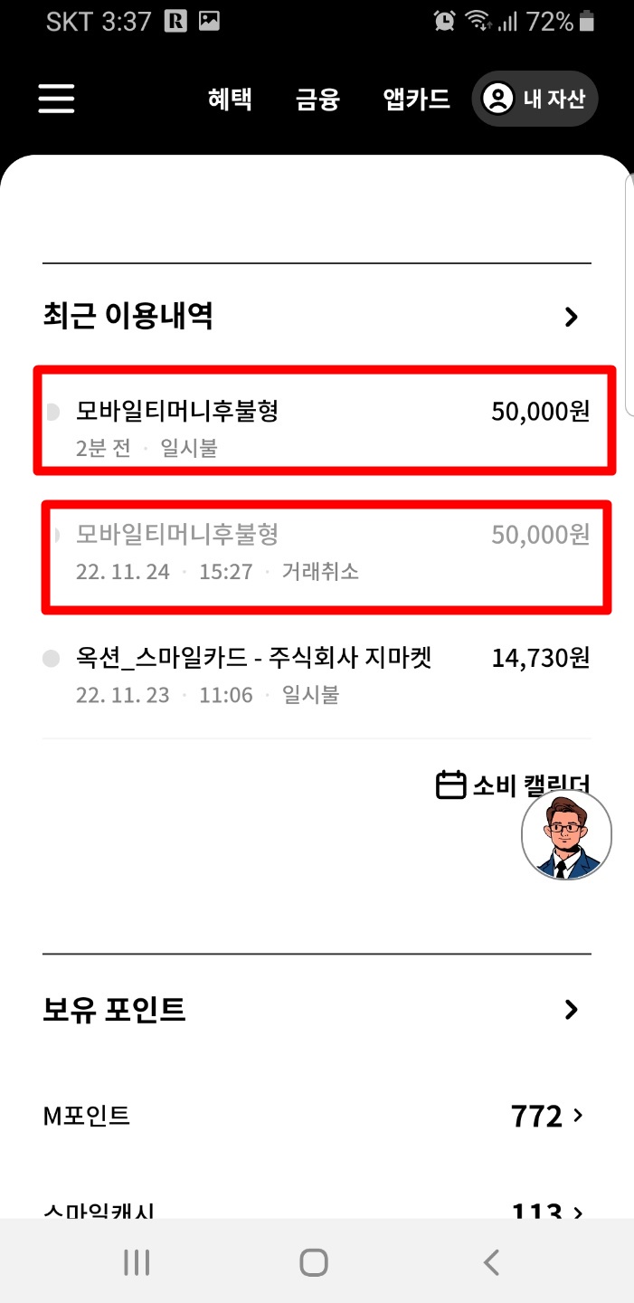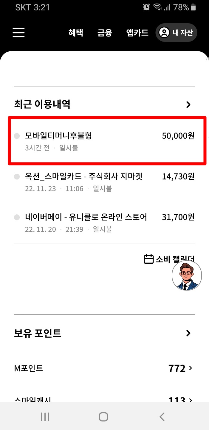 그래서 바로 현대카드 사용내역을 열어보니
