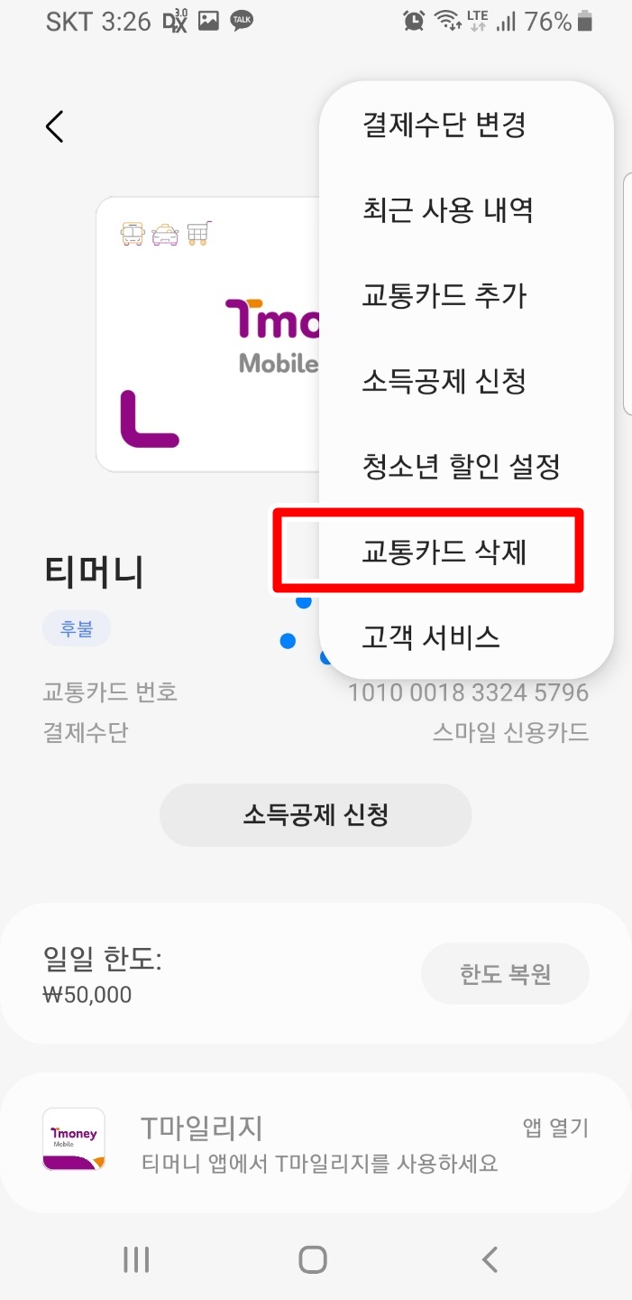 교통카드 삭제를 눌러줍니다.
