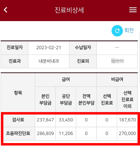 검사료와 초음파진단료로 나뉘어져 있고
