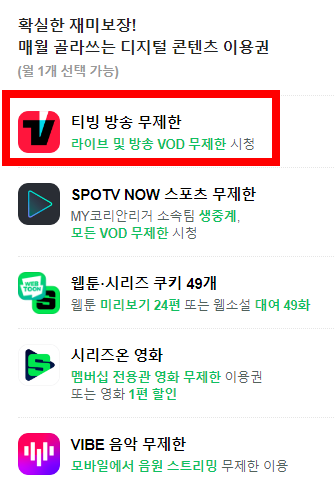무료로 티빙 콘텐츠까지 볼 수 있기 때문에 혜택이 좋습니다.